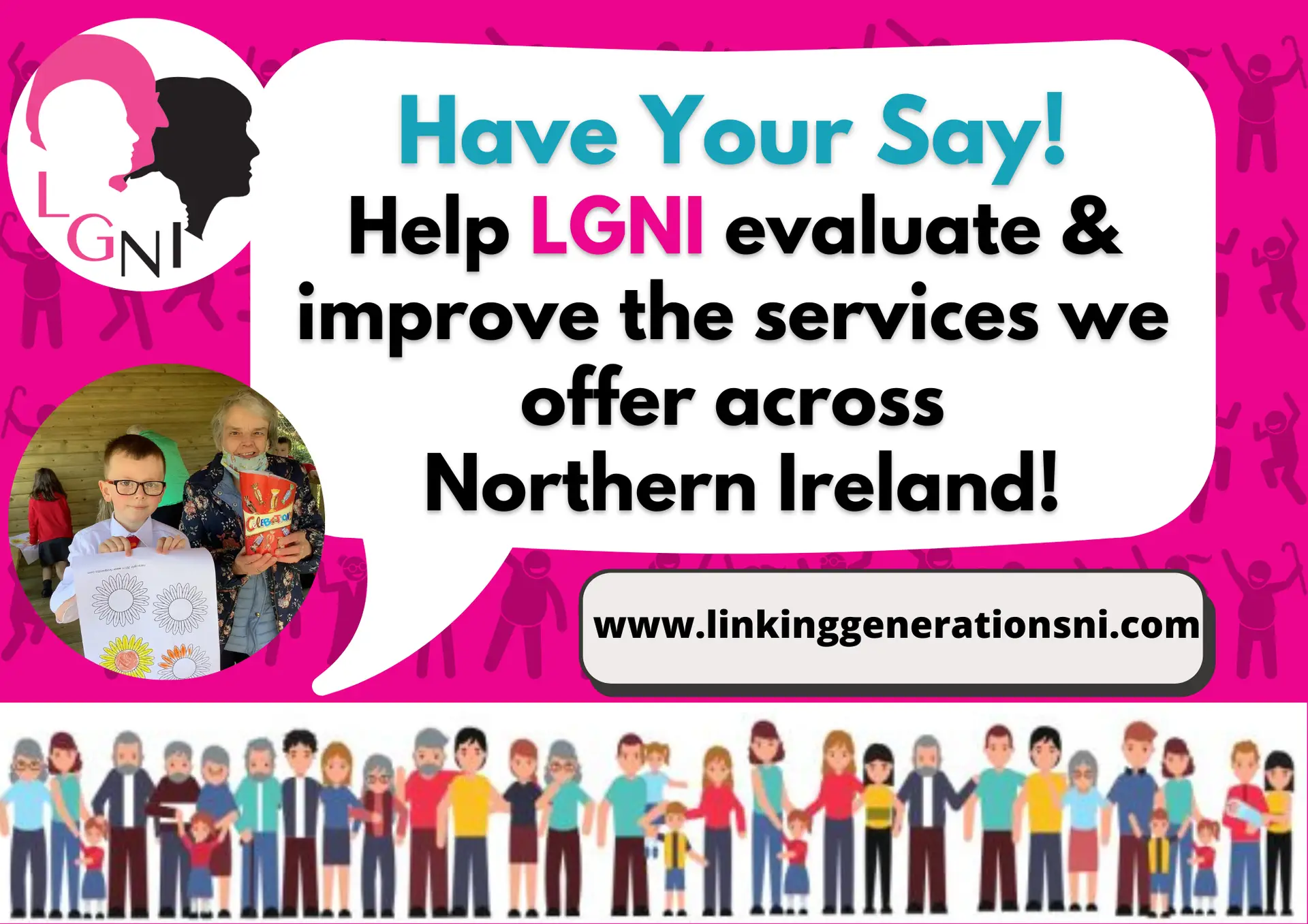 We are so lucky to have a network membership of over 730 enthusiastic contacts interested in developing intergenerational work and are keen to make the best use of our limited time and resources to support this work across NI.  We work with a wide range of people, across a range of agendas and are keen to evaluate and improve our services based on current need.  Our small team would really appreciate it if you could complete a short anonymous survey via the link below to tell us your thoughts and help shape LGNI's future work.   The survey has been developed with support from a QUB student who will be collating findings for LGNI.