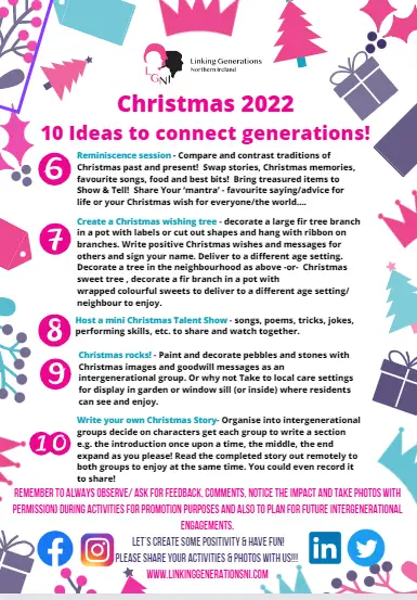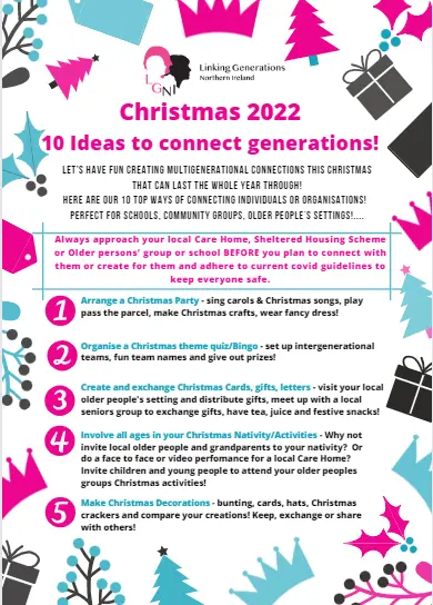 This year LGNI are not only dreaming of a White Christmas but an Age Connected Christmas!  We have all been through a tough few years and with the relaxation of Covid restrictions see such amazing opportunities to connect during the festive season!  We need the help of our supporters and want to share our ideas and resources to inspire you all to reach out and make Intergenerational Christmas Connections!